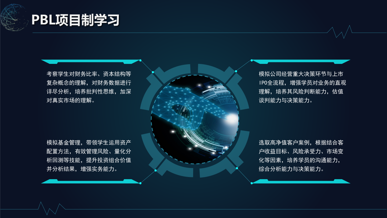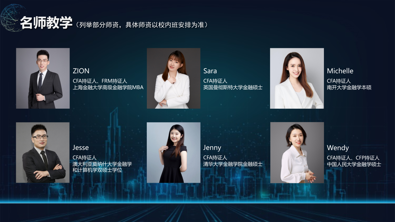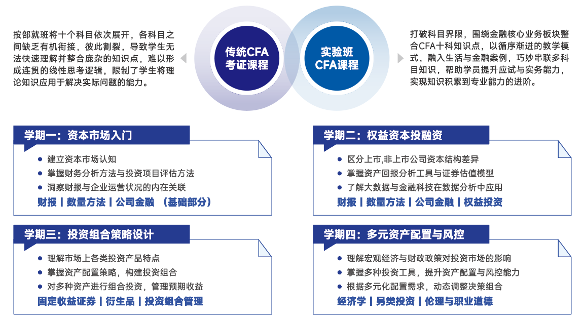 课程围绕CFA考试核心,系统融汇理论学习、实践锻炼与AI等前沿技术深度应用,帮助学生夯实金融知识体系,理解如何运用科技驱动金融创新,锤炼战略思维与跨领域综合能力,培养具备专业精通、眼界开阔、岗位适配力强的未来金融人才。