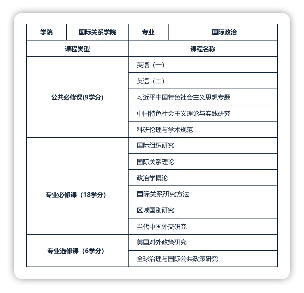 备注:课程具体设置和授课师资以国际关系学院最新教学计划为准。